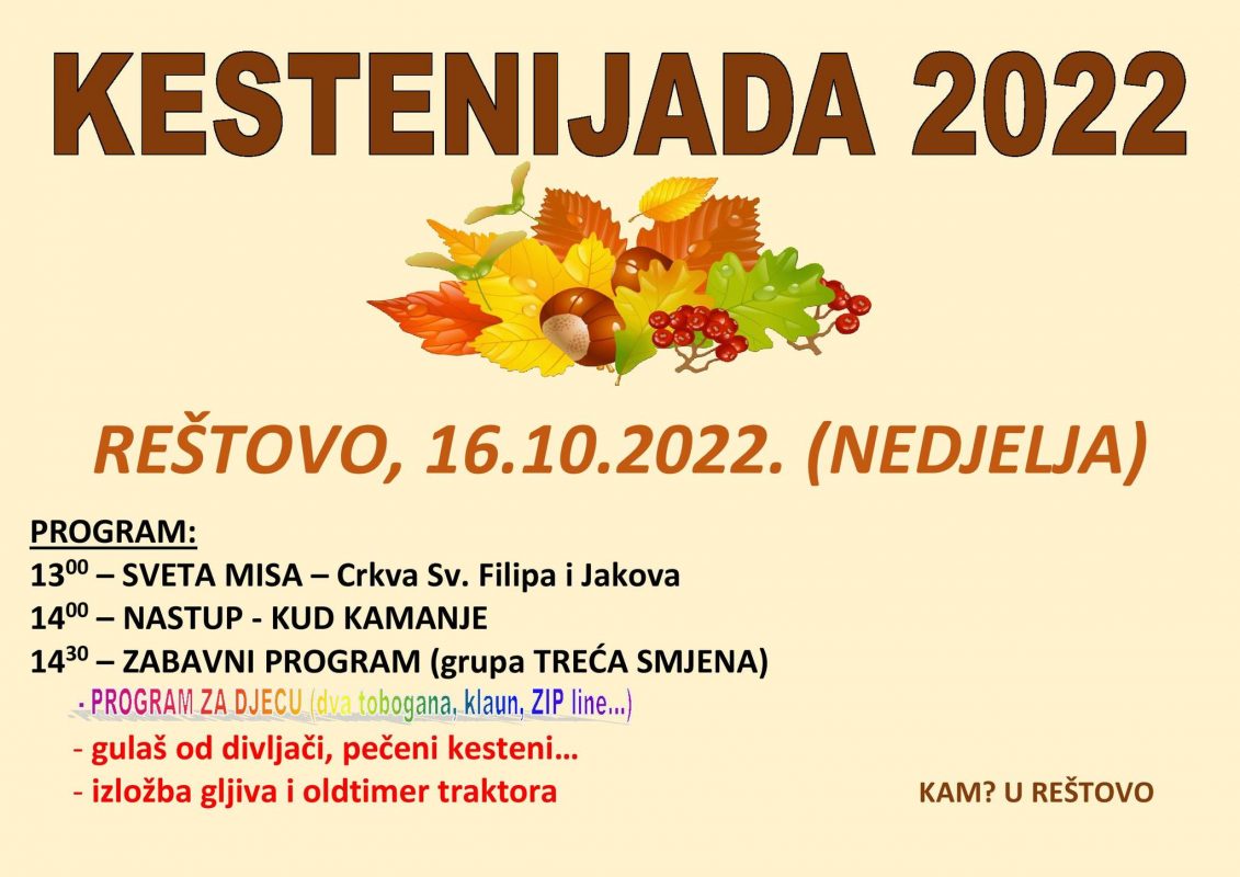 Najavljujemo kako će ove godine Kestenijada u Reštovu biti 16.10. (NEDJELJA), kao i do sada, kod Crkve Sv. Filipa I Jakova.